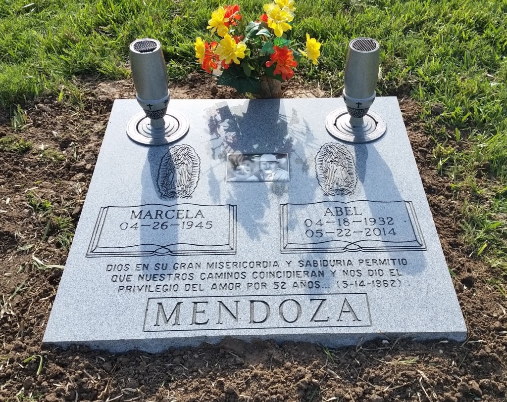 Dedicatoria en la piedra: Con Amor de parte de su familia, siempre estaras en nuestros corazones… Y otro texto en el centro abajo de la porcelana: Juntos para siempre Amor eterno.